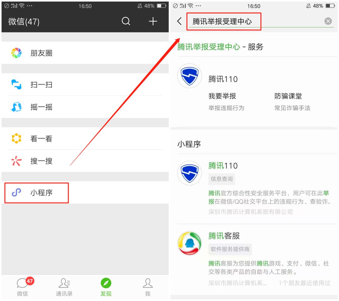 在微信里找到小程序那一栏,点击搜索“腾讯举报受理中心”。