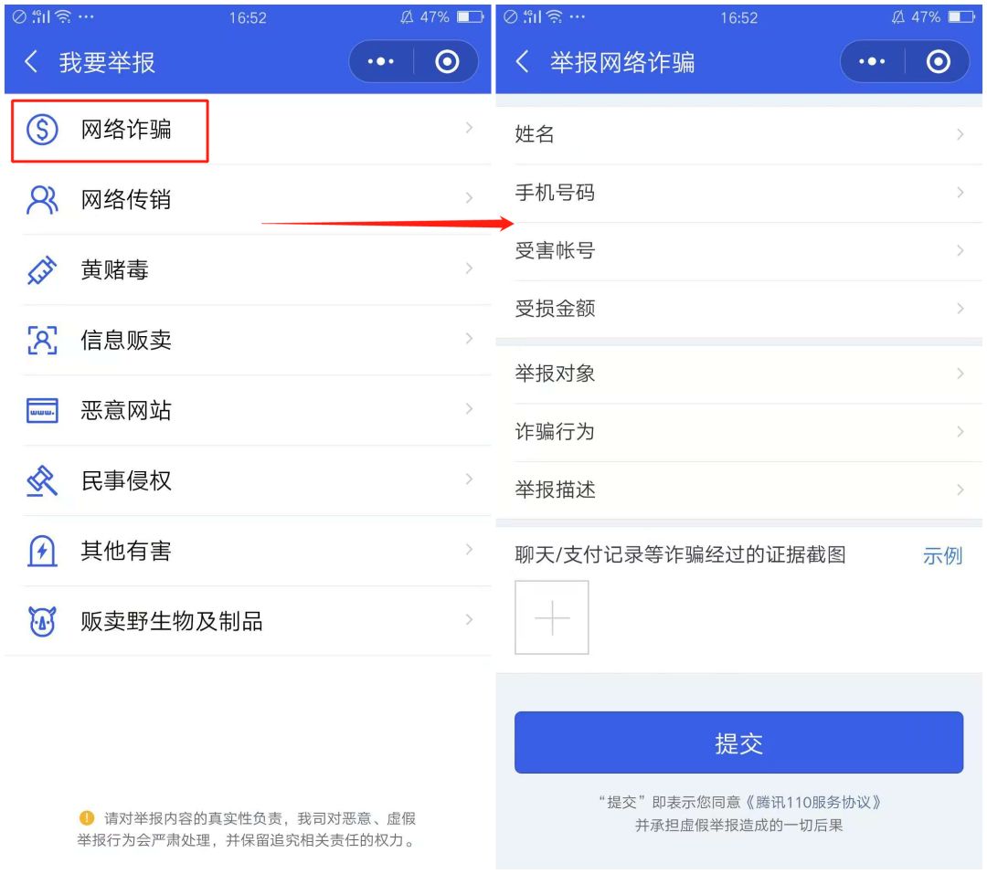 选择“网络诈骗”,按照指示填好相关信息,并提交上当受骗的证据,微信官方会依法依规帮你及时追回相关损失。